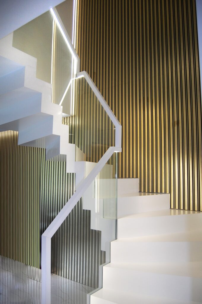 Balustrada szklana z podświetleniem ukrytym i drewnianym pochwytem